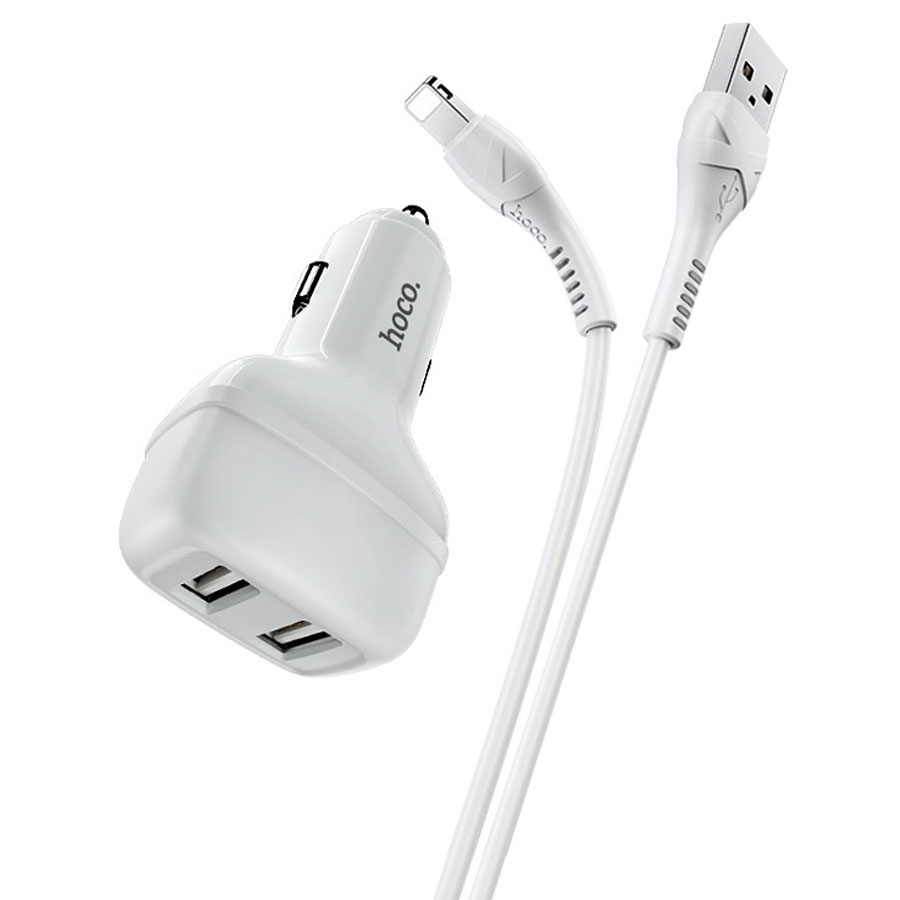 — автомобильное зарядное устройство от HOCO с двумя портами USB-A и встроенным Lightning-кабелем, предназначенное для удобной подзарядки мобильных устройств во время поездок. Оно позволяет заряжать смартфоны, планшеты, наушники и другие гаджеты, подключаясь к стандартной автомобильной розетке 12 В.